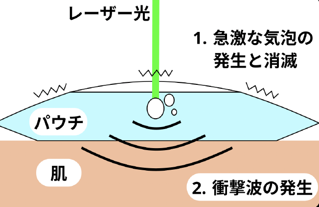 In mid-air haptic feedback, which can convey tactile information without direct contact, laser-based methods can transmit high spatial resolution tactile information over long distances due to the favorable propagation characteristics of lasers in the air. However, the intensity of the tactile stimuli is highly limited due to energy loss during the conversion process from the laser’s optical energy to the mechanical energy of the tactile stimuli. This study proposes a haptic feedback method that leverages a phenomenon known as laser-induced cavitation, where shock waves are generated in a liquid, to output stronger tactile stimuli. In this method, a pouch-type device containing low-boiling-point liquid is attached to the skin, and tactile stimuli are transmitted to the skin via shock waves caused by bubble formation in the liquid when laser light is irradiated onto it. Low boiling-point liquids enable a more efficient conversion of laser energy into shock waves. This paper investigates the conversion of laser energy by measuring the intensity and temperature of the stimuli generated when a laser irradiates a pouch-type device.